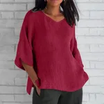 Loose V-neck Solid Color Mid Sleeve Linen T-shirt