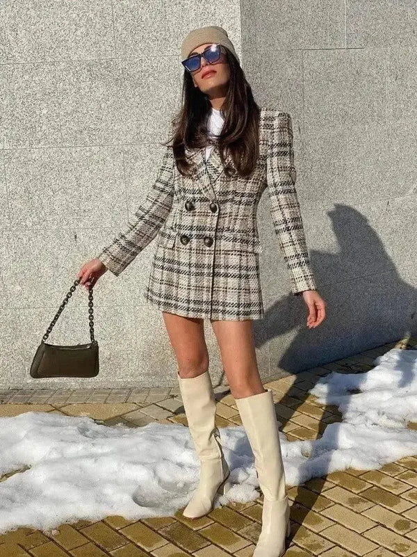 Chic Tweed Jacket & Skirt Set with Knee-High Boots