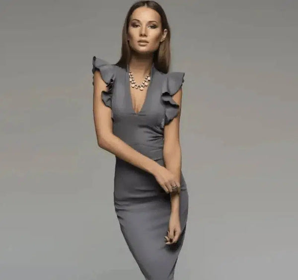 deep V-neck lotus leaf sleeve tight fit dress