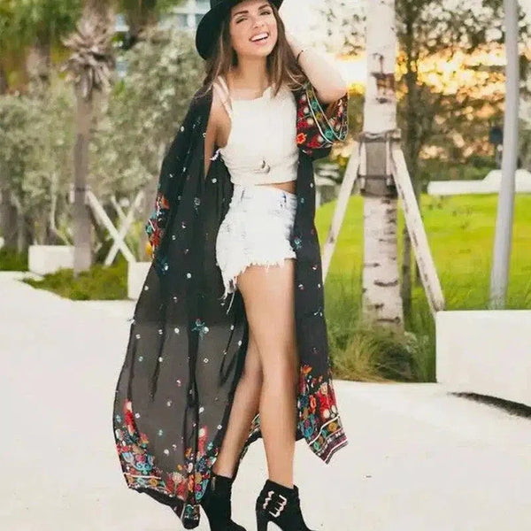 - Type of Garment: Long open-front kimono cardigan with matching crop top and high-waist denim shorts
