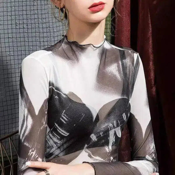 Sleeve Design: Long sleeves complement the high-neck style, providing an elegant and balanced look. The sleeves are tight-fitting, emphasizing the arms' shape and adding to the top's chic aesthetic.