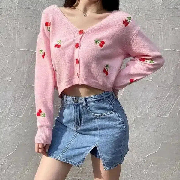 Cherry Embroidered Crop Cardigan with Button-Up Front