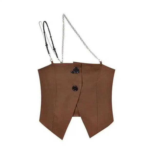 - Additional Details: Features a chain strap detail and double-breasted front button closure