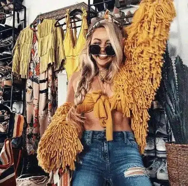 - Type of Garment: Fringed cardigan and tie-front crop top