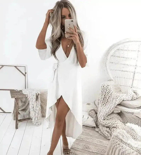 Chic V-Neck Wrap Dress with Asymmetrical Hem