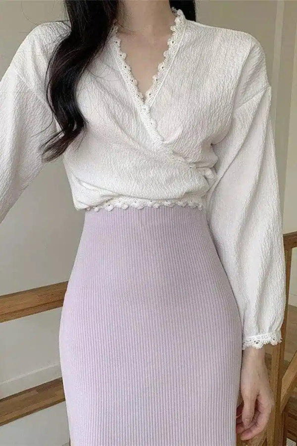 Lace Trim V-Neck Blouse & Knit Pencil Skirt