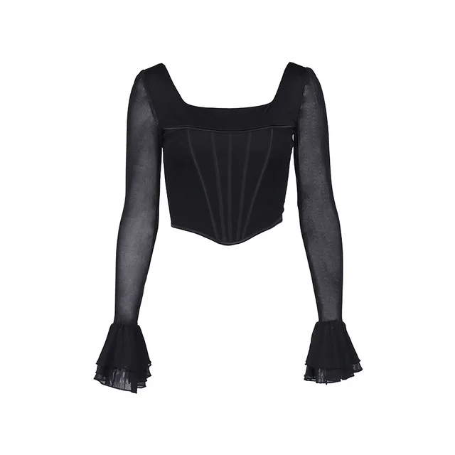 Mesh Fishbone Perspective Square Neck Flared Sleeve Tshirt Cropped