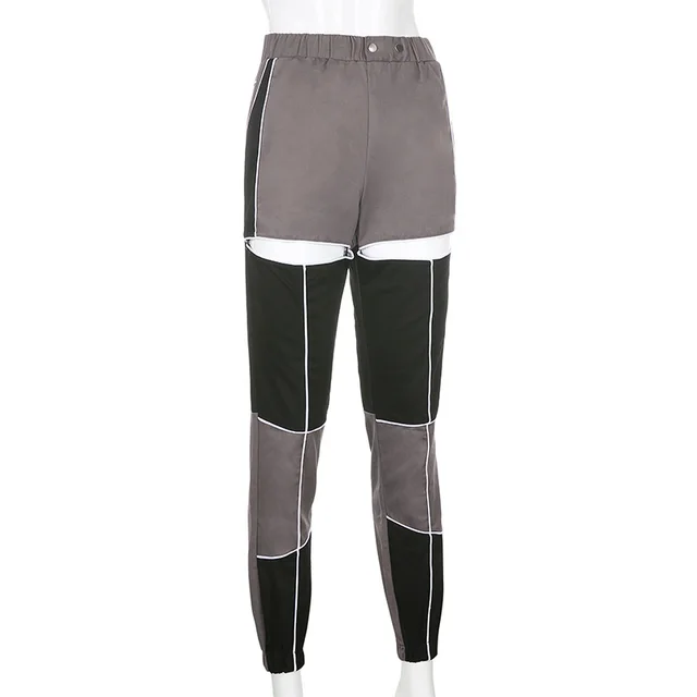 Metal Buckle Hollow Stitching Contrast Color Pants - Grey