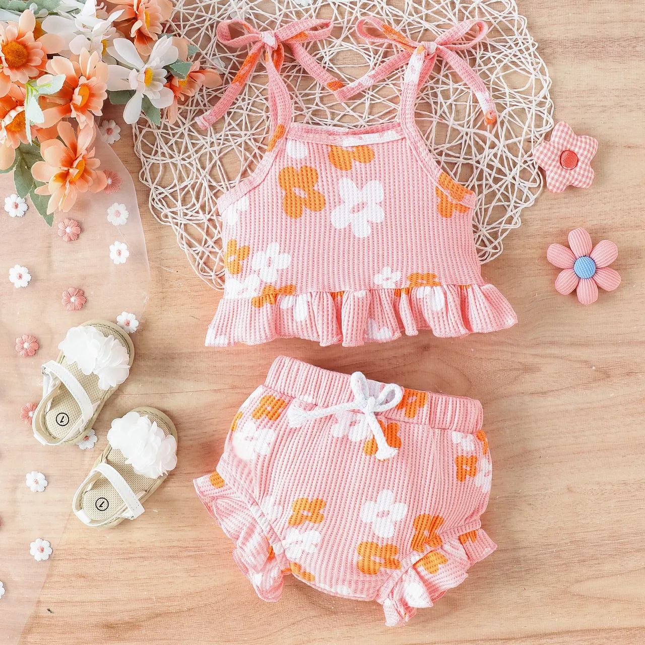 Multicolor Waffle Printed Lace Up Top Shorts -