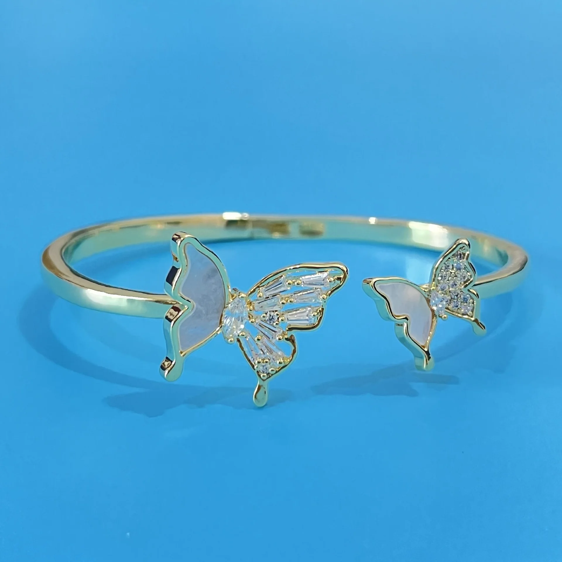 Product information: Color: Golden Open-end butterfly bracelet AB09451K, Silver open butterfly bracelet AB09451HK Inlaid material: Shell Material: copper plated real gold AAA zircon natural shell Popular elements: Butterfly Style: fashion OL Packing list: Bracelet *1 Product Image: