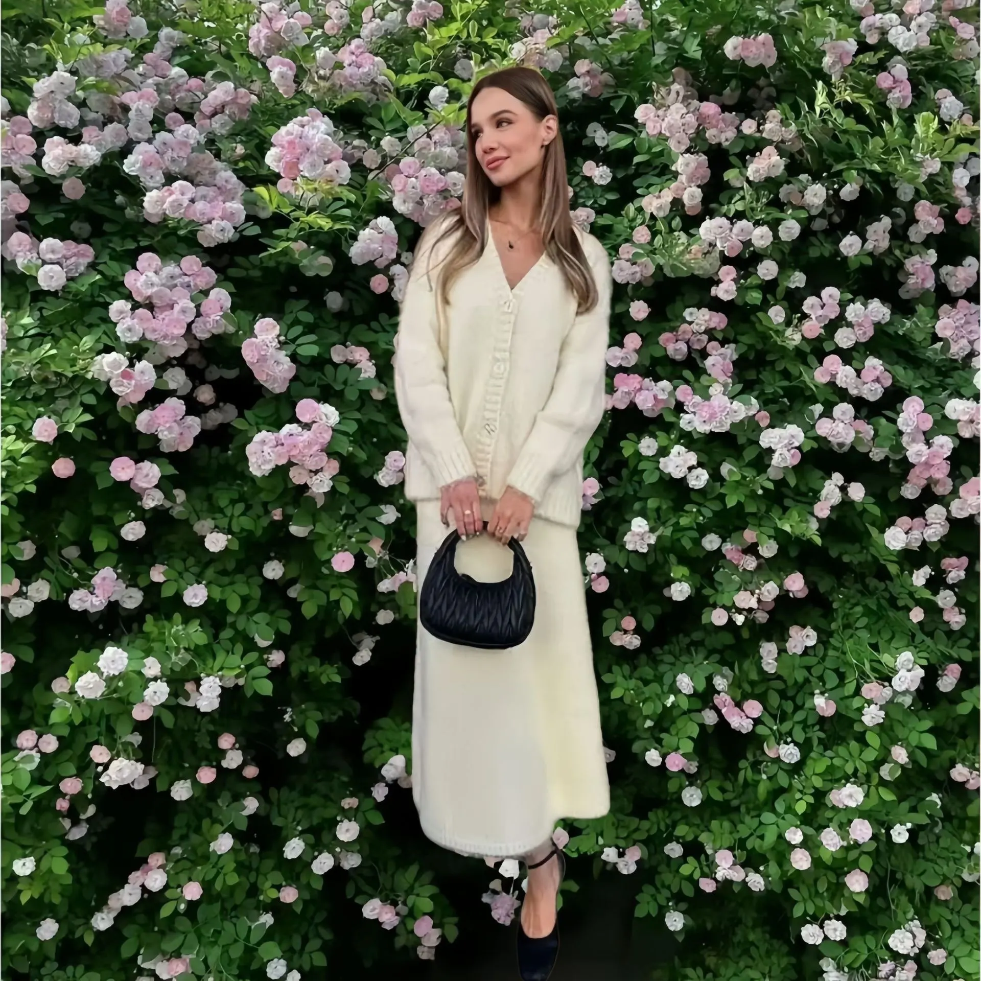 Temperament V-neck Sweater Cardigan Coat Skirt Suit - White