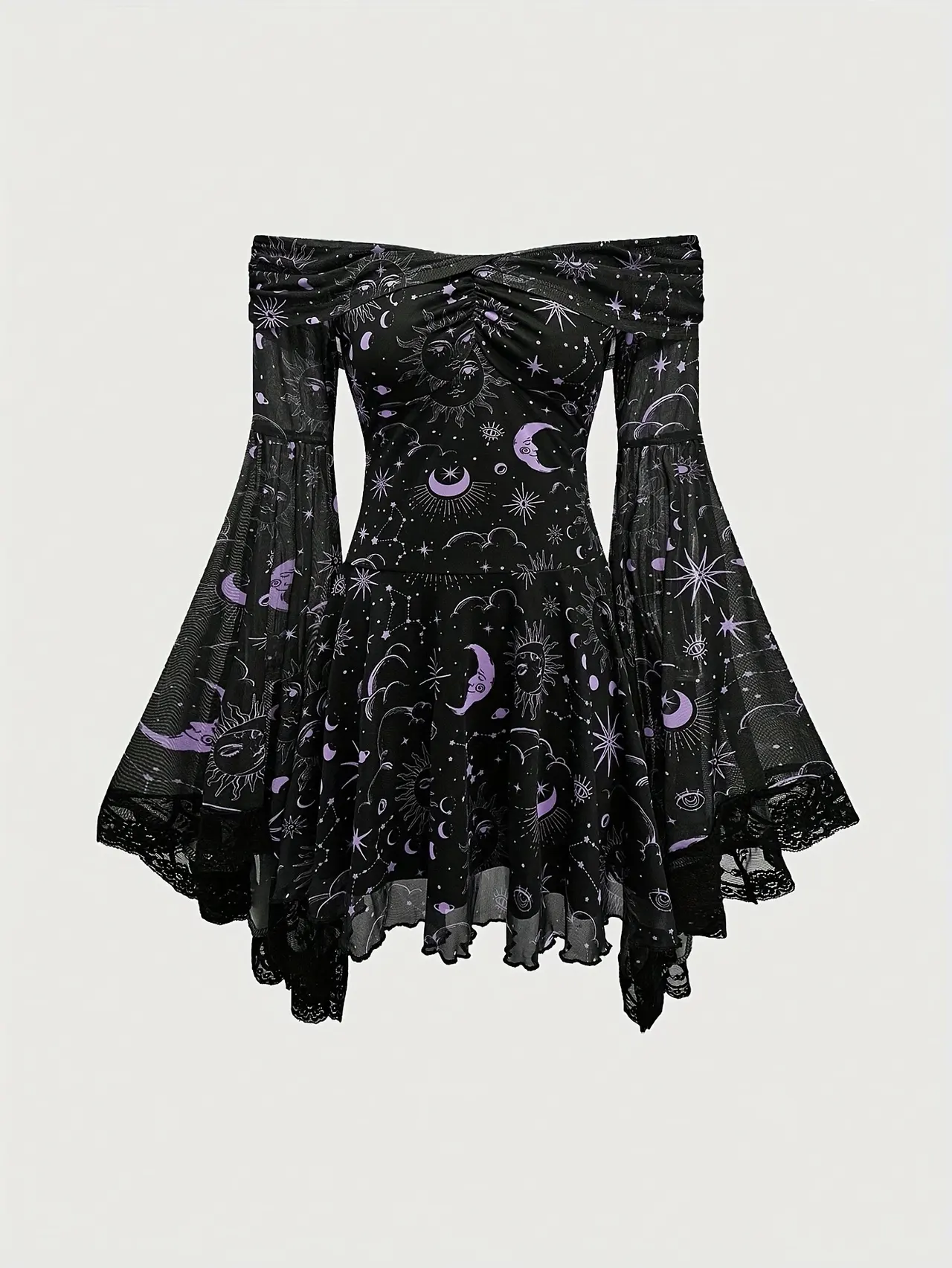 Product information: Pattern: Cosmic starry sky Color: Black Gold, black and white, sky blue, violet, Peach Waist Type: Mid waist Size: XS,S,M,L,XL,XXL Sleeve type: bell sleeve Main fabric composition: Polyester (polyester fiber) Note: Packing list: Dress*1 Product Image: