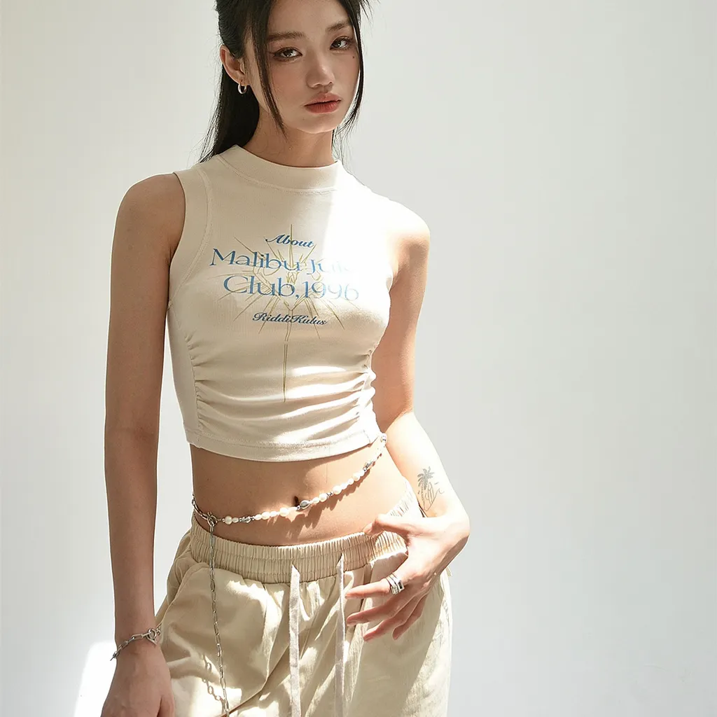 Original Letter Print Pleated I-shaped Vest Female - Light Khaki