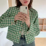 Outer Tower Green Houndstooth Pearl Button Small Fragrant Wind Short