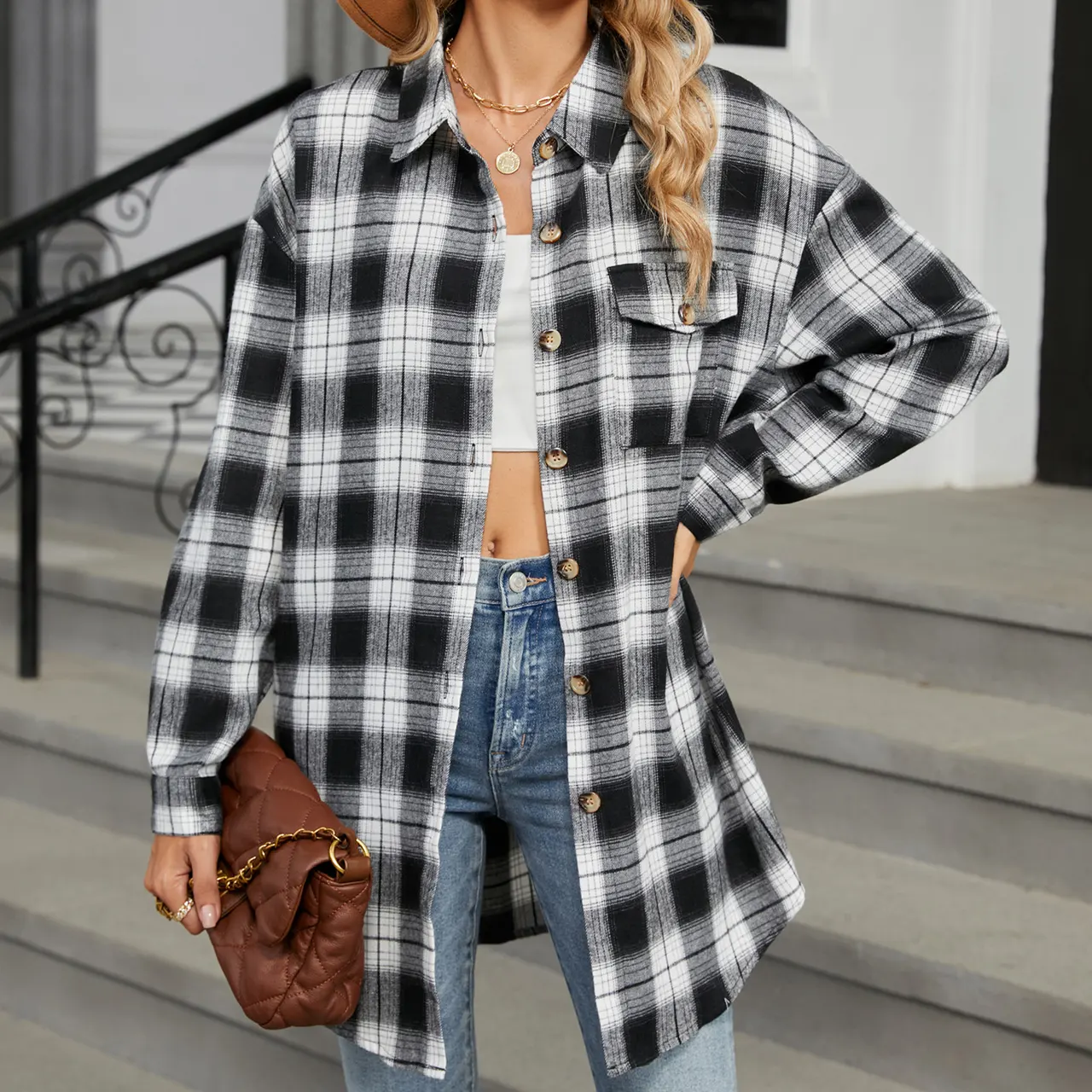 Oversize Bf Style Plaid Brushed Long Sleeve Shirt - Black And White