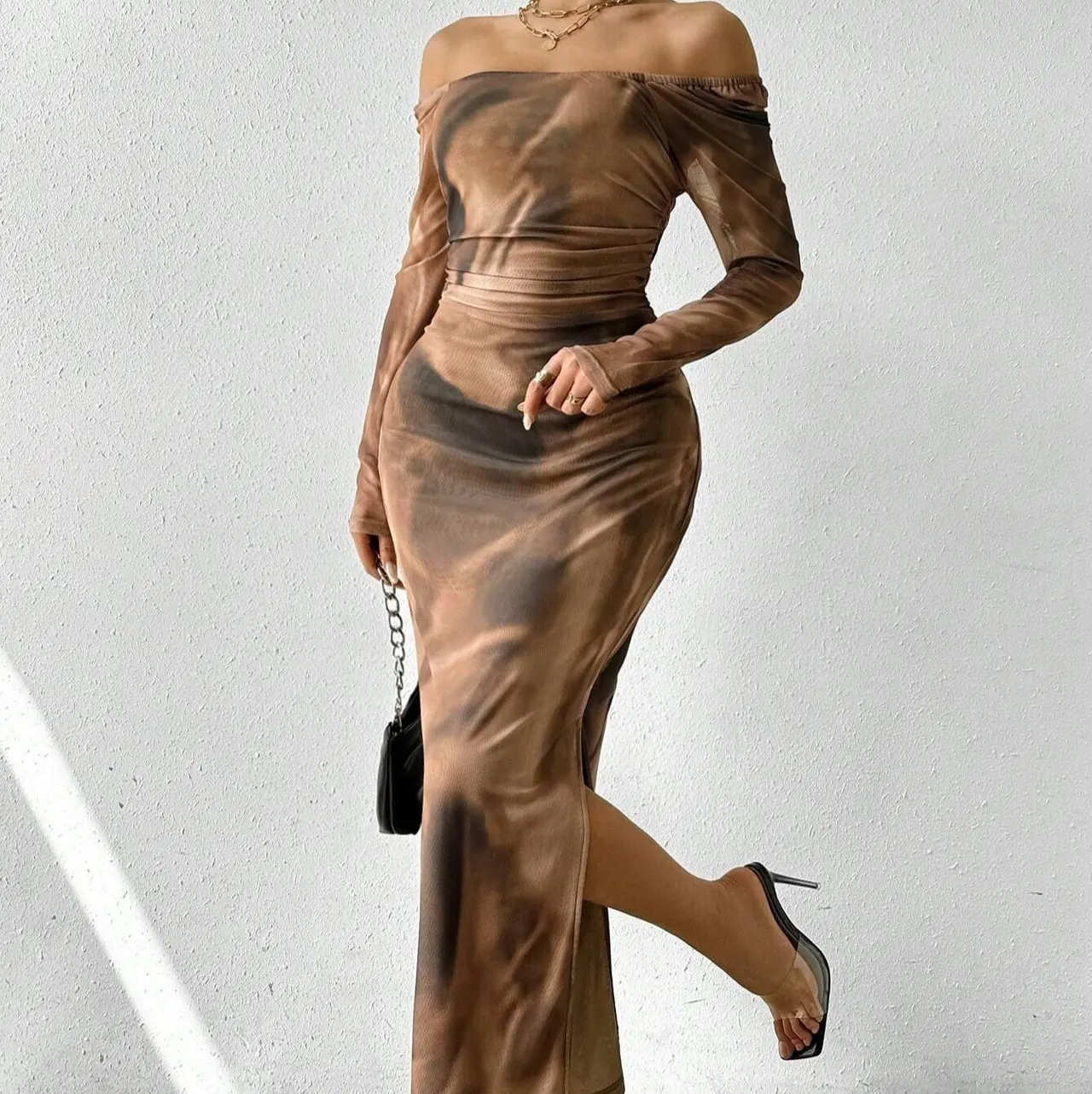 Printed Pleated Sexy Tight Split Square Collar Dress - Camel