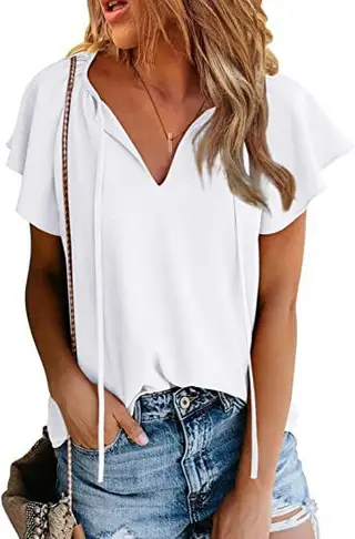Product information: Fabric name: Chiffon Main fabric composition: polyester fiber (polyester) The content of the main fabric ingredient: 30%-50% Collar type: V-neck Sleeve type: trumpet sleeve sleeve length: short sleeve Popular elements: lace, wood ear edge Size Information: Size: S/M/L/XL/XXL Size Lenght Bust S 65 96 M 66 102 L 67 106 XL 68 114 2XL 69 122 Note: 1. Asian sizes are 1 to 2 sizes smaller than European and American people. Choose the larger size if your size between two sizes. differences due to . 2. Please check the size chart carefully before you buy the item, if you don't know how to choose size, please contact our customer service. 3.As you know, the different computers display colors differently, the color of the actual item may vary slightly from the following images. Packing list: coat x1