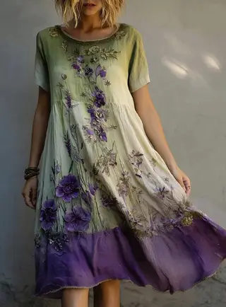 Purple Floral Print Gradient Flowy Linen Midi Dress - Green