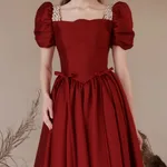 Red Satin Puff Sleeve Evening Gown - Wine Red