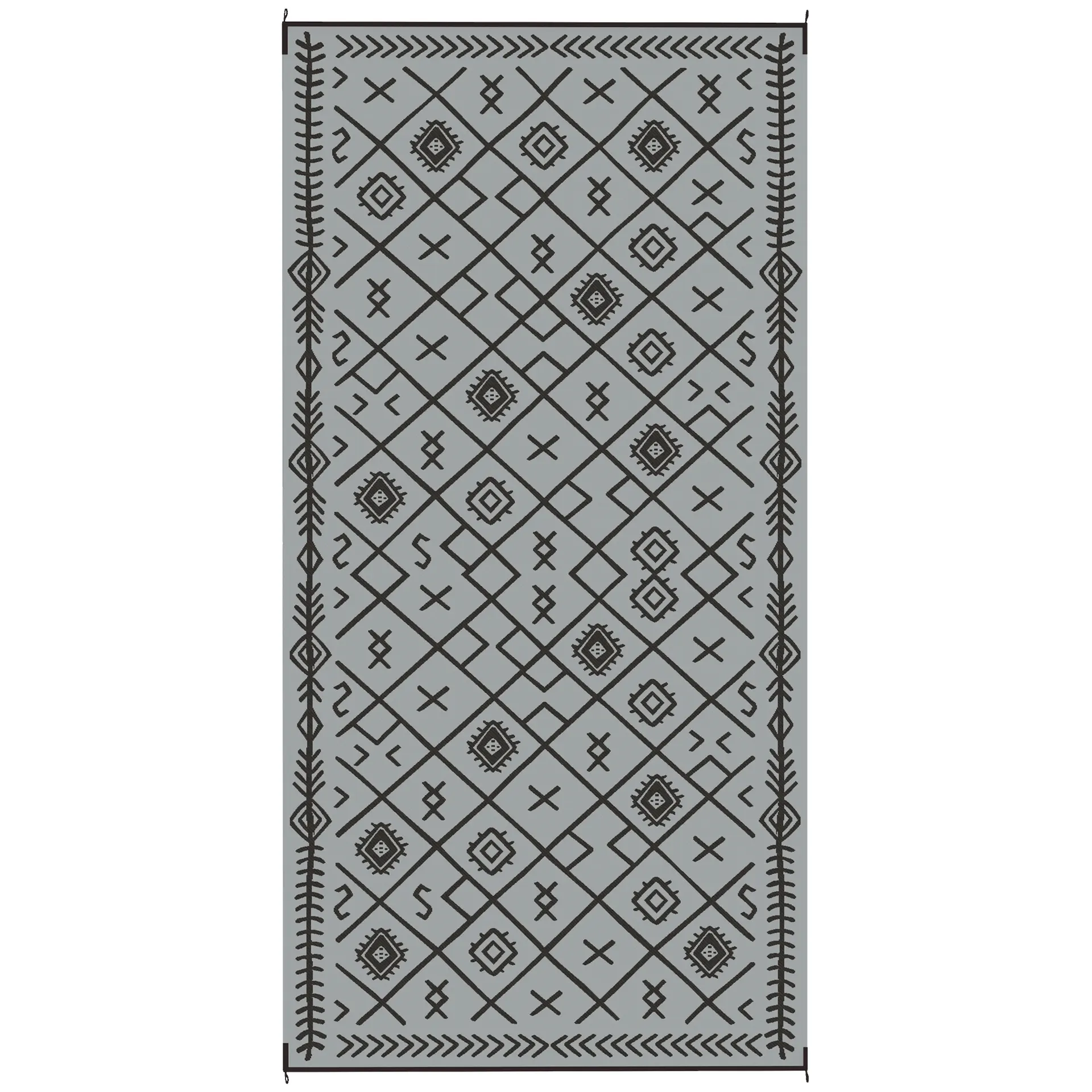 Features: - Reversible with double sides for varied use - Made of polypropylene, with a protective coating to help prevent fading and sun damage - Features robust edging to prevent fraying - Space-saving foldable design for easy storage and transport - Carry bag included - Versatile for camping, picnics, RV road tours, and more Specification: - Color: Black and Gray - Style: Rhombus - Materials: 310g/m² Polypropylene, Non-Woven Fabric - Dimensions: 215.7" L x 107.9" W - Carry Bag Dimensions: 36.6" L x 13.4" W x 7.5" H - Note: Not fireproof, keep away from fire Package Includes: - 1 x Outdoor Rug - 1 x Carry Bag