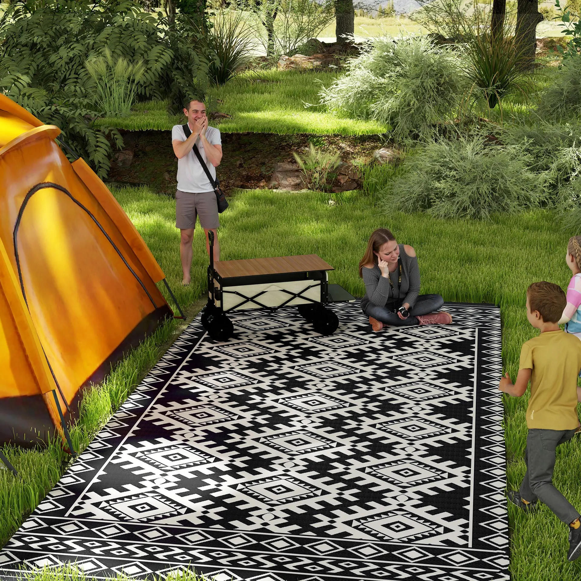 Features: - Reversible with double sides for varied use - Made of polypropylene, with a protective coating to help prevent fading and sun damage - Features robust edging to prevent fraying - Space-saving foldable design for easy storage and transport - Carry bag included - Versatile for camping, picnics, RV road tours, and more Specification: - Color: Black and White - Style: Rhombus Border - Materials: 310g/m² Polypropylene, Non-Woven Fabric - Dimensions: 215.7" L x 107.9" W - Carry Bag Dimensions: 36.6" L x 13.4" W x 7.5" H - Note: Not fireproof, keep away from fire Package Includes: - 1 x Outdoor Rug - 1 x Carry Bag