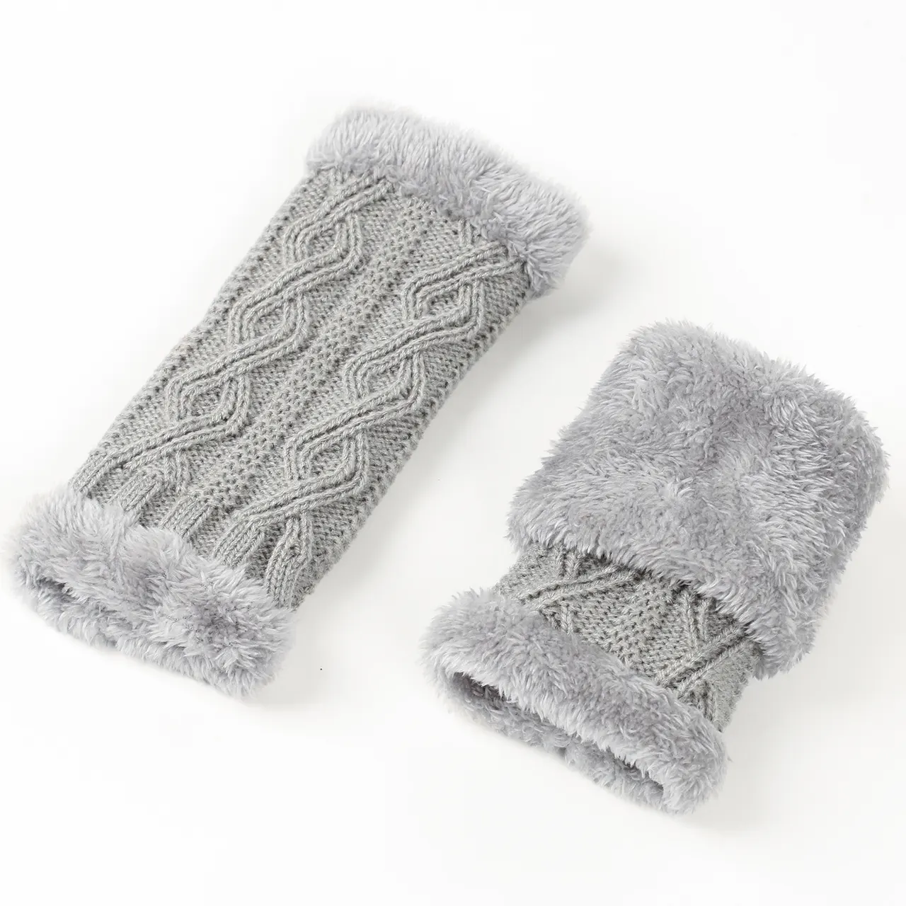 Rhombus Short Knitted Plus Fluff Thick Gloves - Light Gray 4