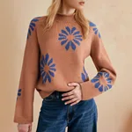 Round Neck Flower Color Collision Design Knitted Sweater - Khaki