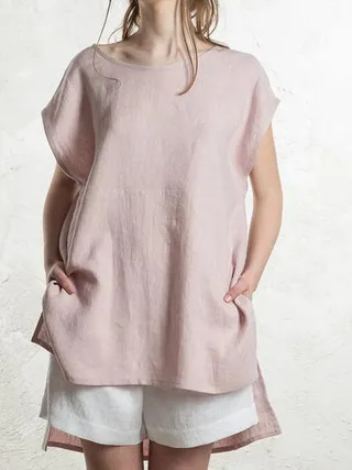 Round Neck Front Short Back Long Short Sleeve Top For - Pink