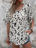 Round Neck Lace Up Leopard Print Blouse Temperament Leisure Top -