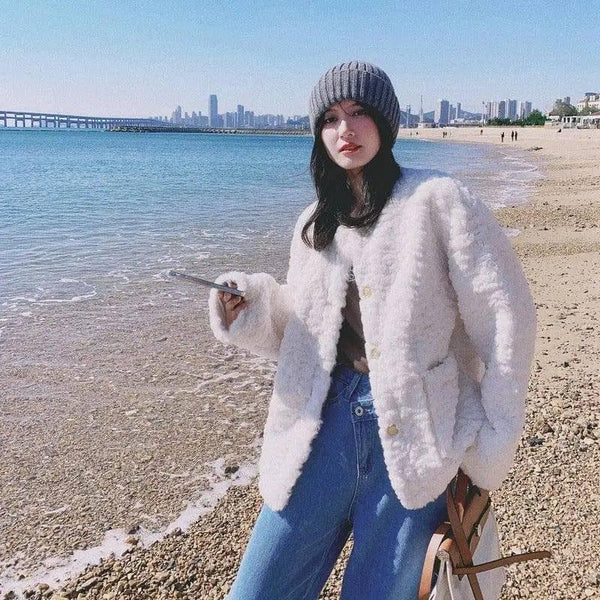 Round Neck Metal Buckle Rabbit Fur Coat Women