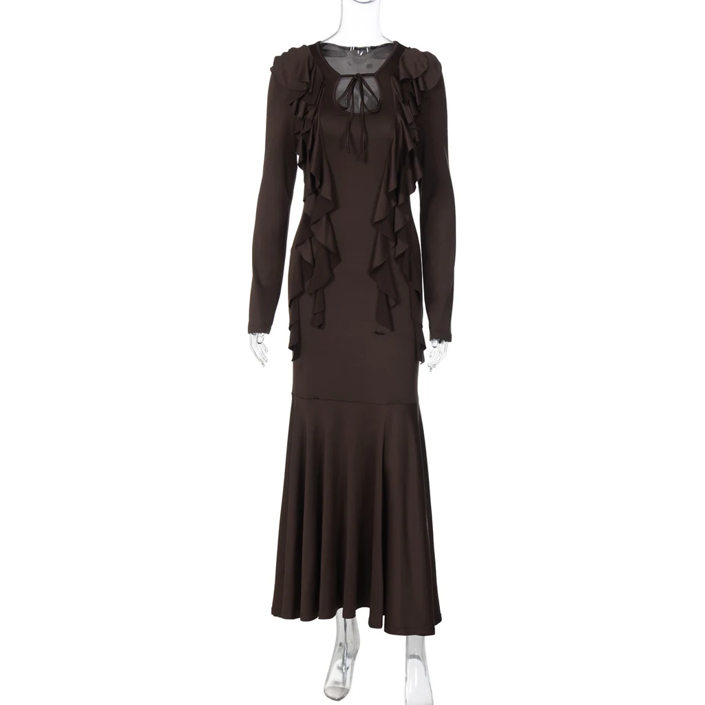 Ruffles Lace-up Long Sleeve Waist Dress - Brown