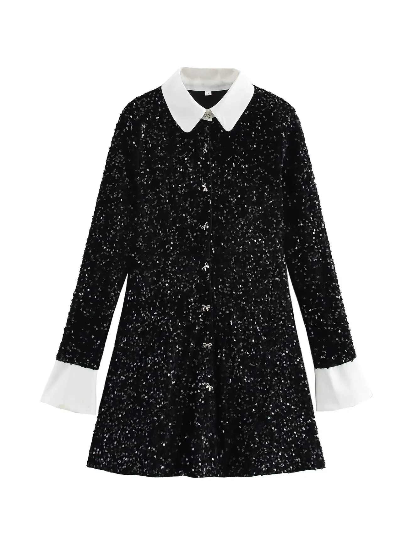 Sequin Cinched Patchwork Contrast Color Button Long Sleeve Mid-length