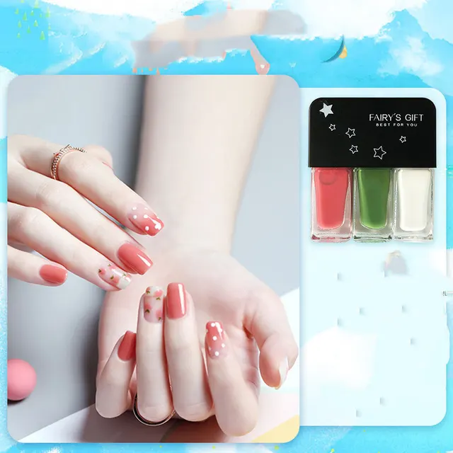 Product information Net content: 4g*3pcs (g/ml) Color: A1 nail polish + primer + matte seal, A2 lemon star, A3 dot candy, A4 taro mud, A5 cool mint, A6 red wine rose Specifications: normal specifications Packing list Nail polish set x1