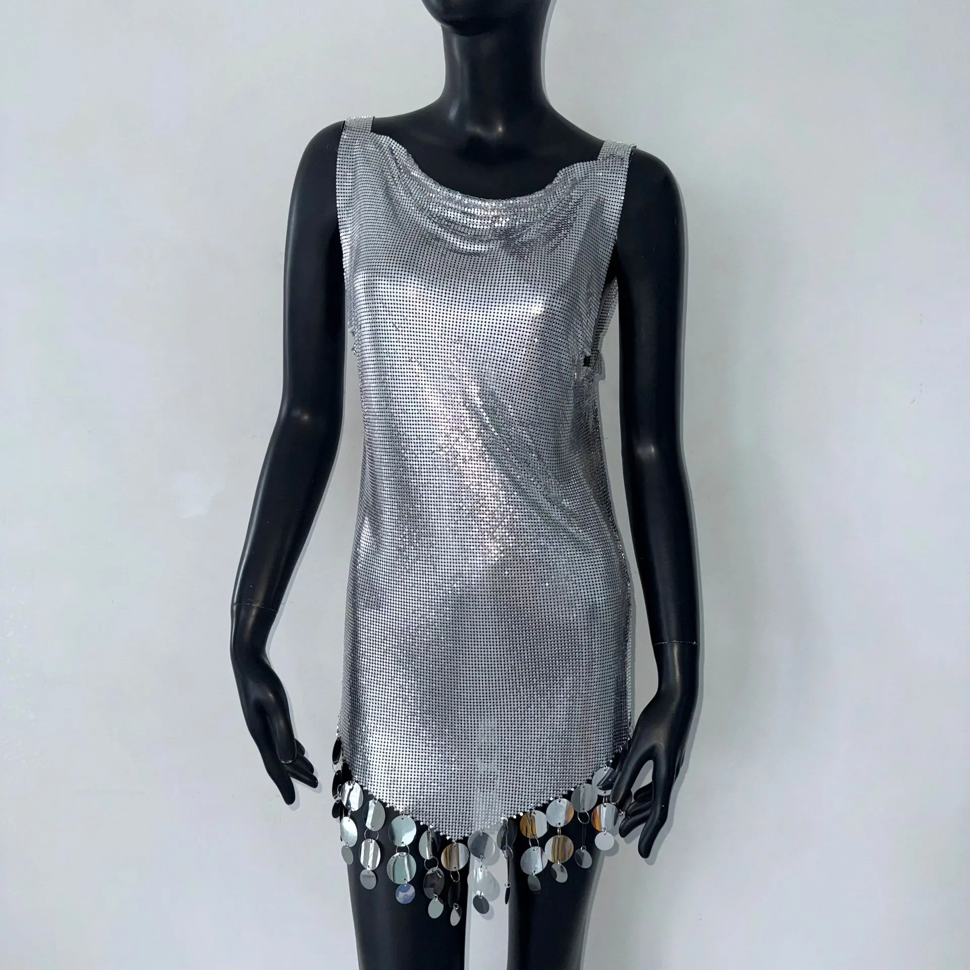 Product information: Skirt type: vest skirt Color: Silver Size: S,M,L Popular elements: Sequins Style: pullover Fabric name: Metal Sleeve type: sleeveless Craft: collage/stitching Size: Note: 1. Asian sizes are 1 to 2 sizes smaller than European and American people. Choose the larger size if your size between two sizes. differences due to . 2. Please check the size chart carefully before you buy the item, if you don't know how to choose size, please contact our customer service. 3.As you know, the different computers display colors differently, the color of the actual item may vary slightly from the following images. Packing list: Dress*1pc Product Image: