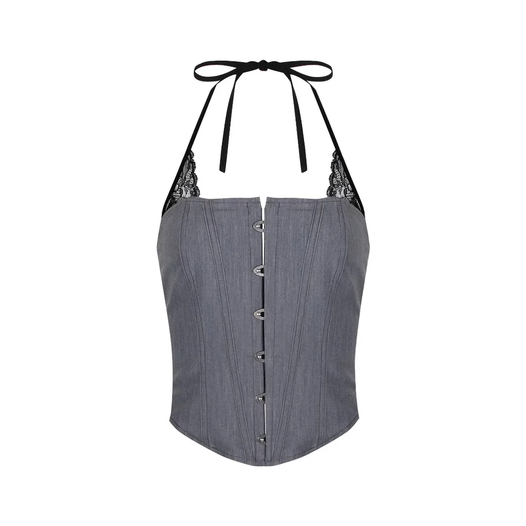 Sexy Lace Stitching Short Navel-exposed Halter Top - With Lining