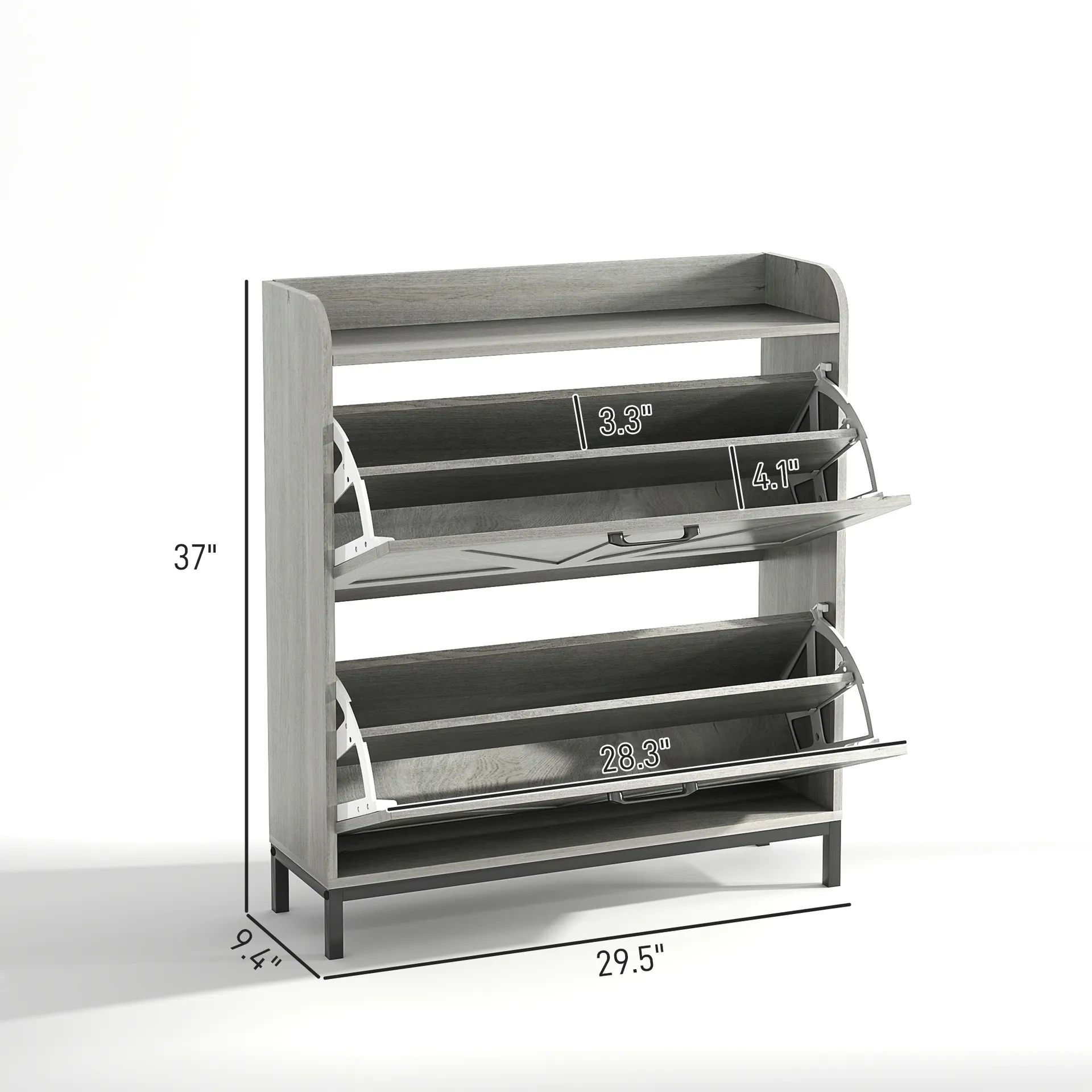 Features: - Stores up to 12 pairs (max size 10), optimizing your footwear organization - Two flip drawers, each with adjustable, removable dividers for customization - Farmhouse style with X-shaped barn doors and wood grain finish enhances decor esthetic - Steel legs and selected particle board for long-lasting use - Smooth melamine surface simplifies cleaning efforts - Raised edges keep items secure, preventing accidental falls - Includes anti-tip kit to ensure furniture stability and safety - Flip drawer design efficiently utilizes narrow spaces Specification: - Color: Light Gray Woof Effect - Material: Particleboard - Overall Dimensions: 29.5" W x 9.4" D x 37" H - Drawer Panel Size: 28.3" W x 13.8" H - Each Tier Size: 4.1" W x 11.8" H / 3.3" W x 9.3" H - Max Shoe Capacity: 12 Pairs - Max Shoe Size: US 10 - Weight Capacity: 66 lbs. (Overall), 22 lbs. (Top/ Each Drawer) Package Includes: - 1 x Shoe Cabinet - 1 x Manual
