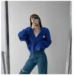 Short Long Sleeve Waffle Loose Hooded Sweatshirt - Royal