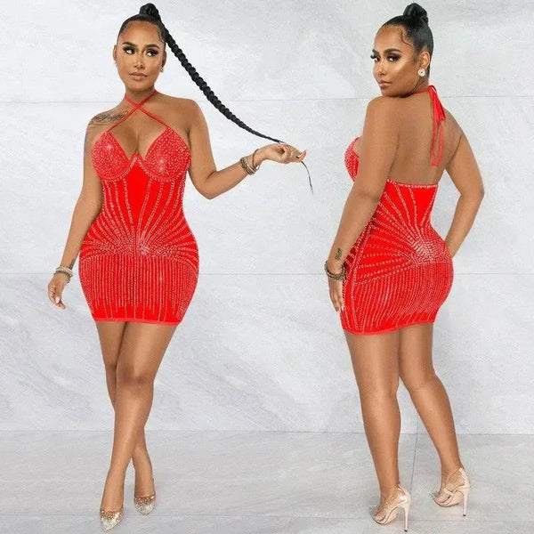 Sling Wrapped Chest Rhinestone Perspective Skirt Dress