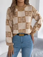 Snowflake Plaid Lantern Sleeve Pullover Sweater - Khaki