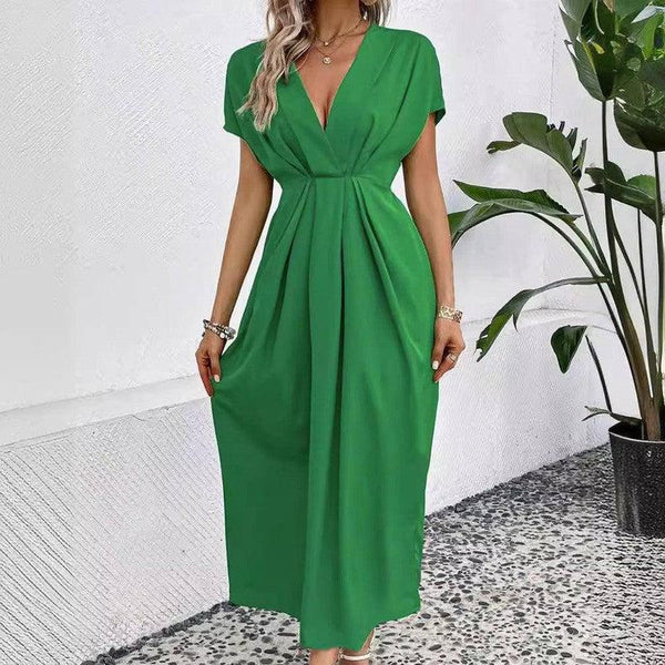 Solid Color Deep V Shoulder Sleeve Folding Elastic Waist