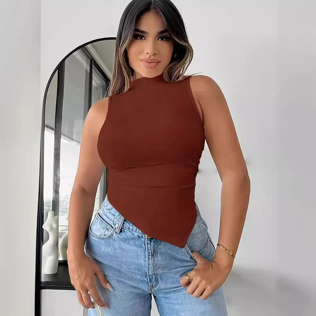 Solid Color Rib Fabric Thread Stretch Sleeveless Knitted Top - Brown