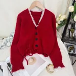 Stitching Lace Knitted Cardigan V-neck Sweater - Red