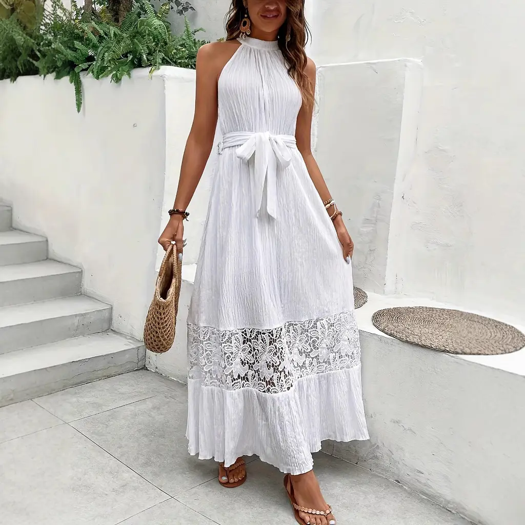 Stitching Lace Halter Seaside Holiday Dress - White