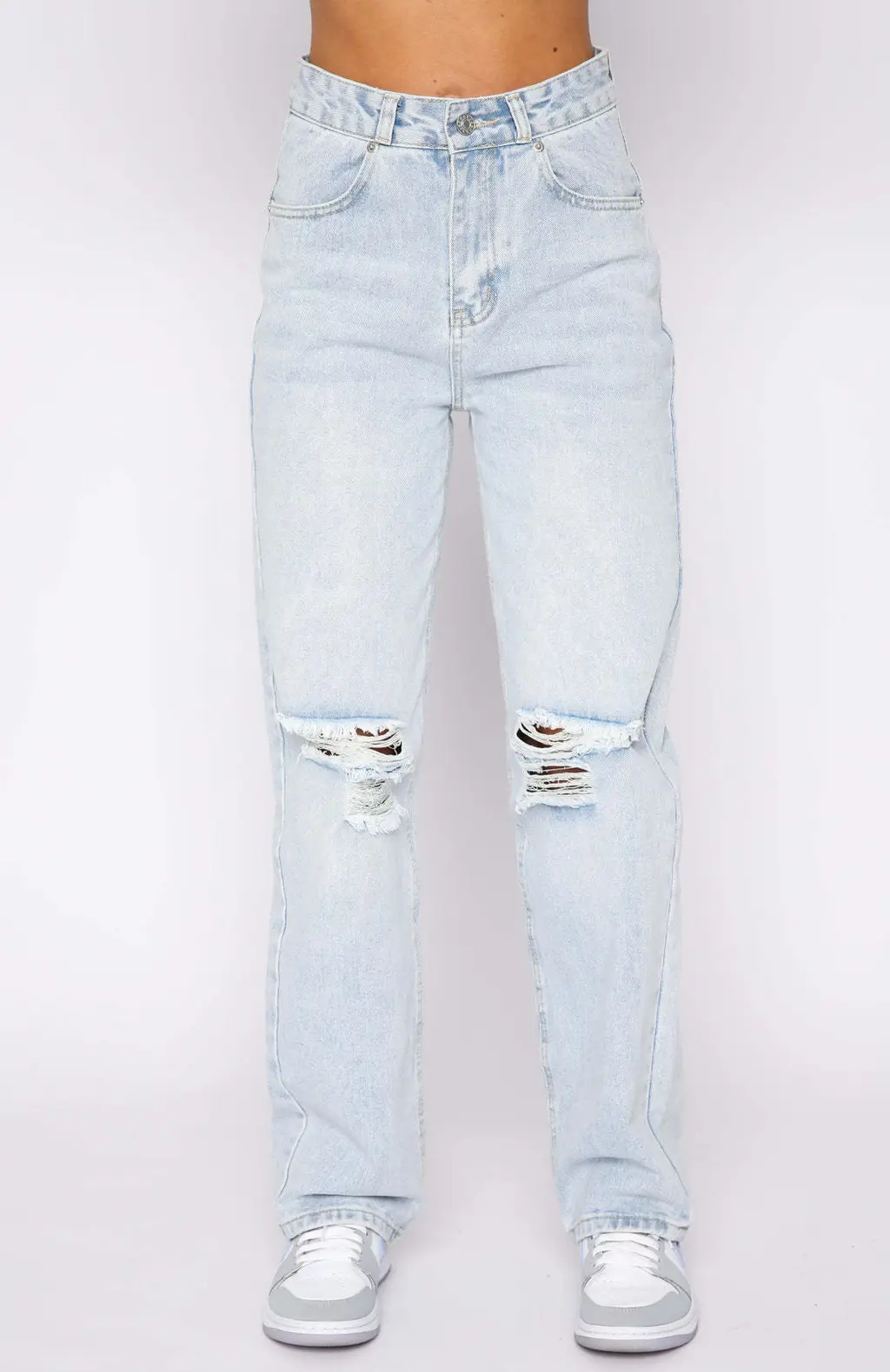 Hipster Ripped Washed Denim Straight Trousers - Light Blue