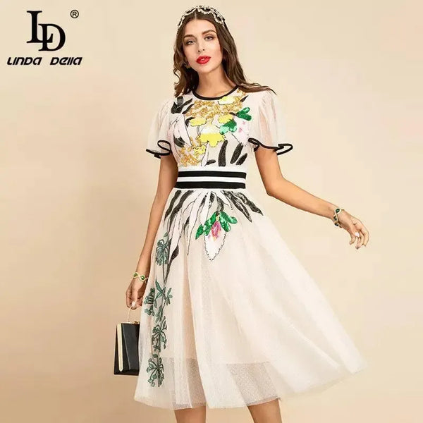 LD LINDA DELLA New 2021 Women Summer Fashion Runway Midi Dress Butterfly Sleeve Sequined Embroidery Ladies Slim A-Line Dresses