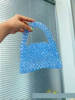 Product information: Color: grass green finished bag + shoulder strap, water blue finished bag + shoulder strap Style: cross-border trend Material: Acrylic Popular elements: weaving, beading pattern: plain Hardness: Soft Size information: Upper width Lower width height Handle height 16 18 12 9 Packing list: Acrylic handbag*1