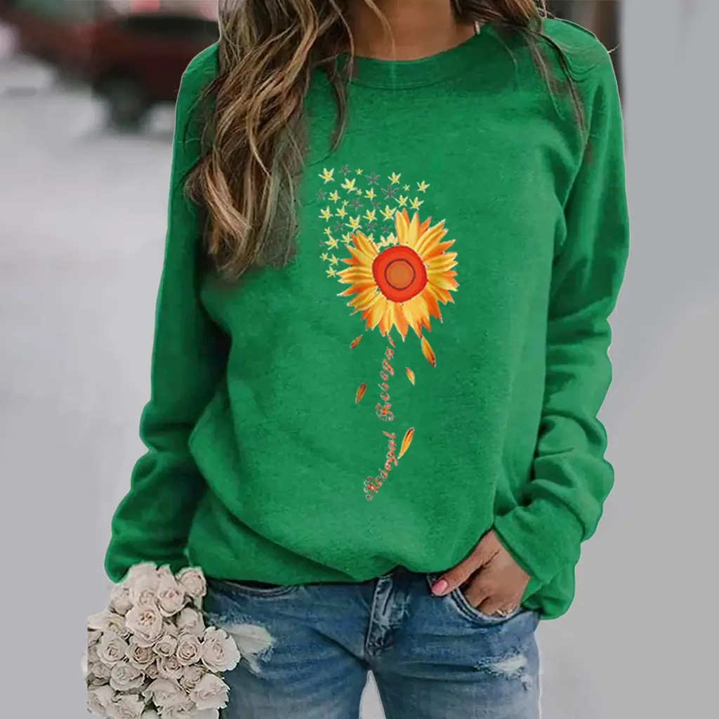 Sunflower Pattern Printing Long Sleeve Crew Neck Sweater - Green