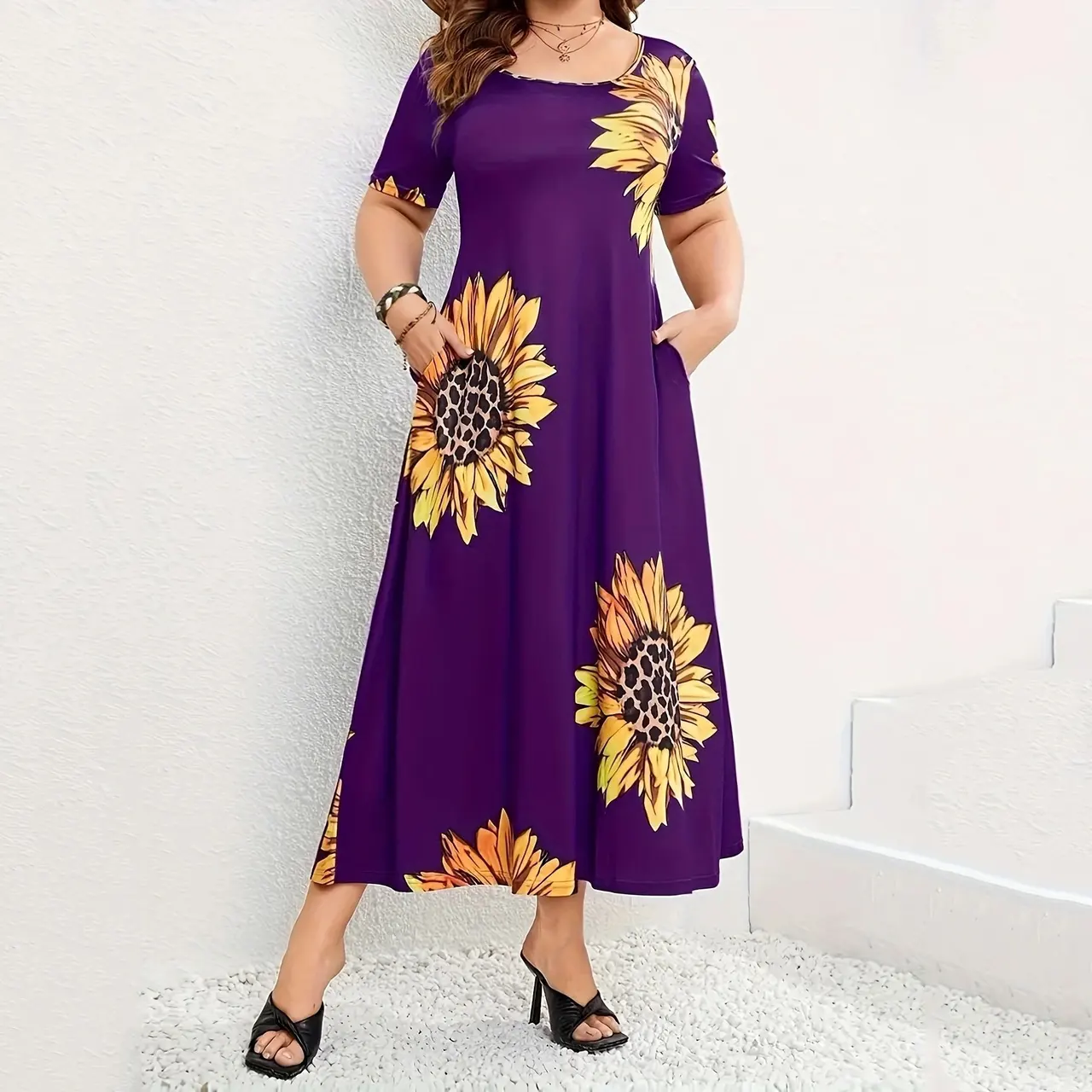 Sunflower Print Loose Short Sleeve Dress - Purple