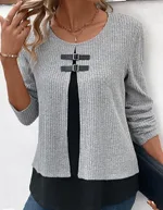 Sunken Stripe Fake Two Pieces Leather Ring Design Long Sleeve Knitted