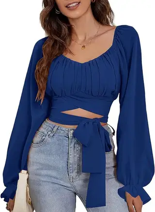 Top Exposed Navel Lantern Sleeve Off-the-shoulder Collar - Blue